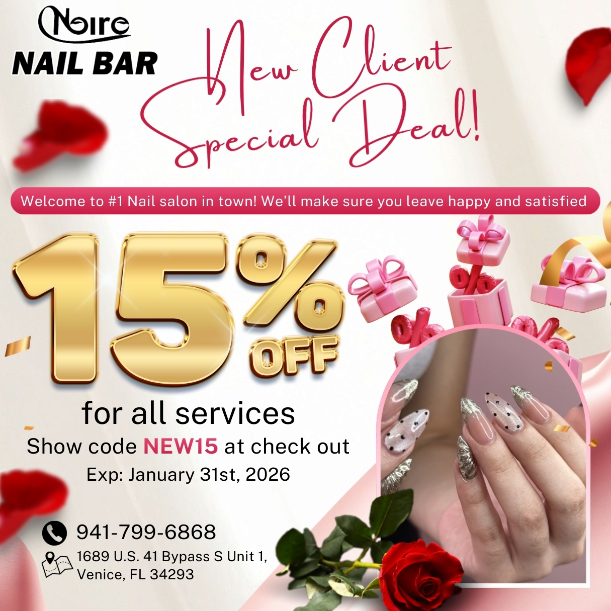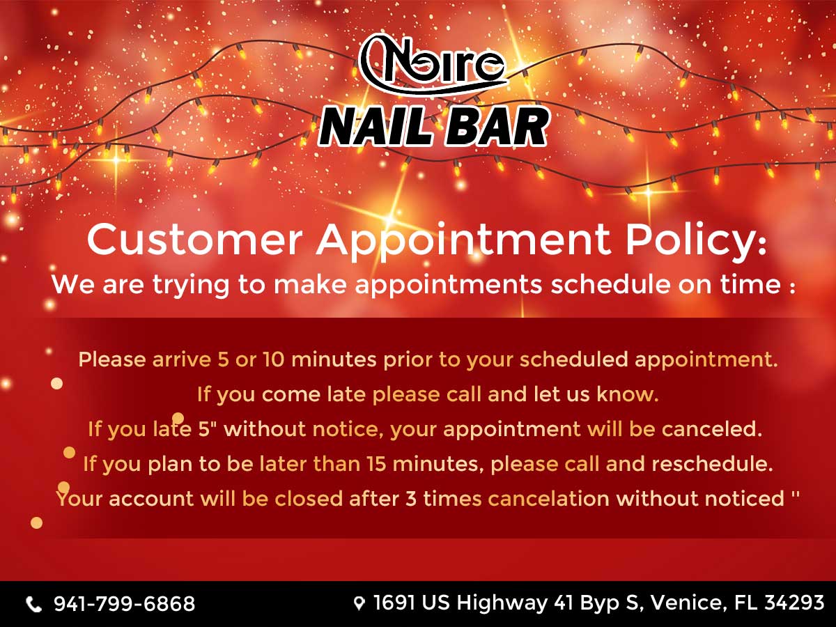 Let’s visit, have a relaxing time, and become prettier after enjoying high-end services at one of the best Nails Salons in Venice: Noire Nail Bar. Located at a beautiful corner in Venice, FL 34293, we always try our best to deliver the highest level of customer satisfaction.
